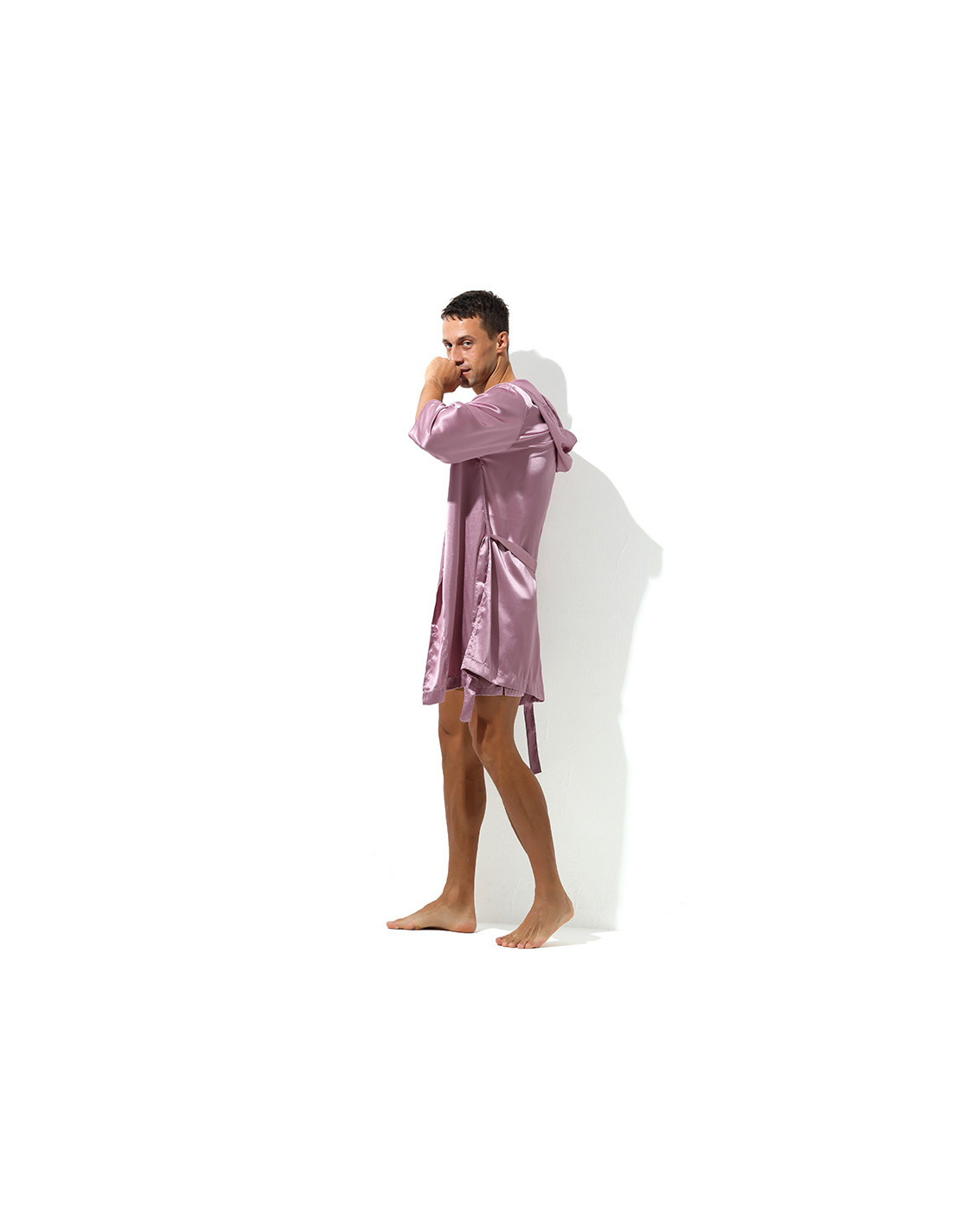 Халат мужской атласный бледно розовый с капюшоном