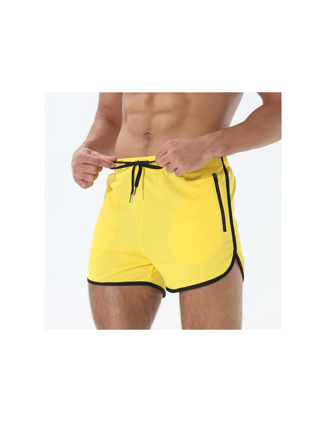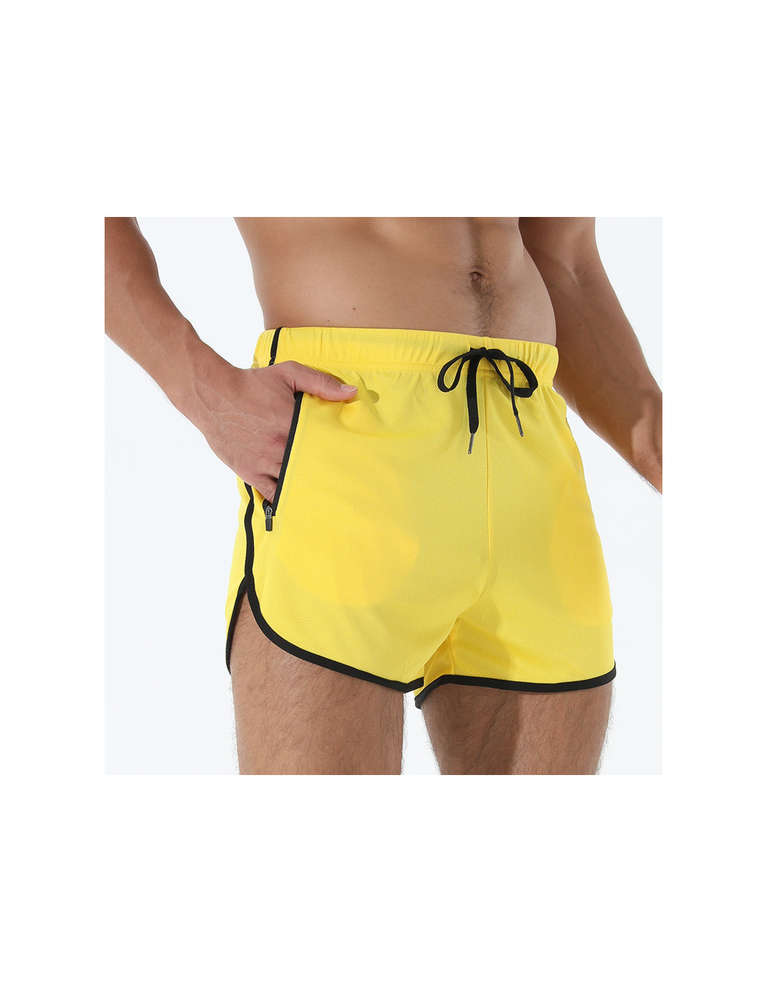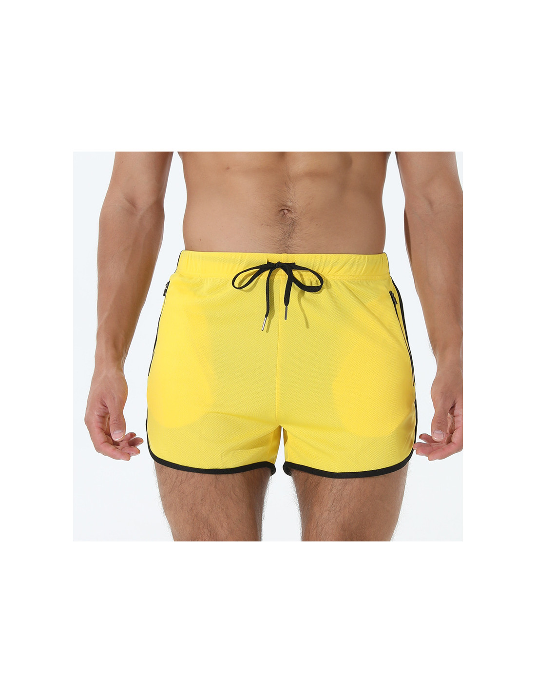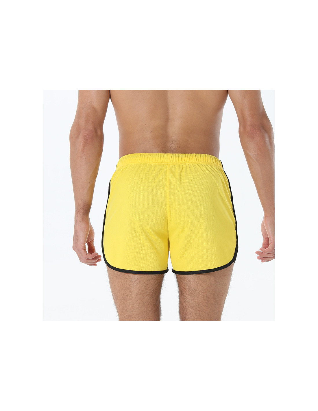 Яркие короткие мужские спортивные шорты желтого цвета для интенсивных тренировок. Легкая сетчатая ткань хорошо проветривается, быстро отводит влагу и быстро сохнет. Подходят для бега, кроссфита, фитнеса и занятий в спортзале.
