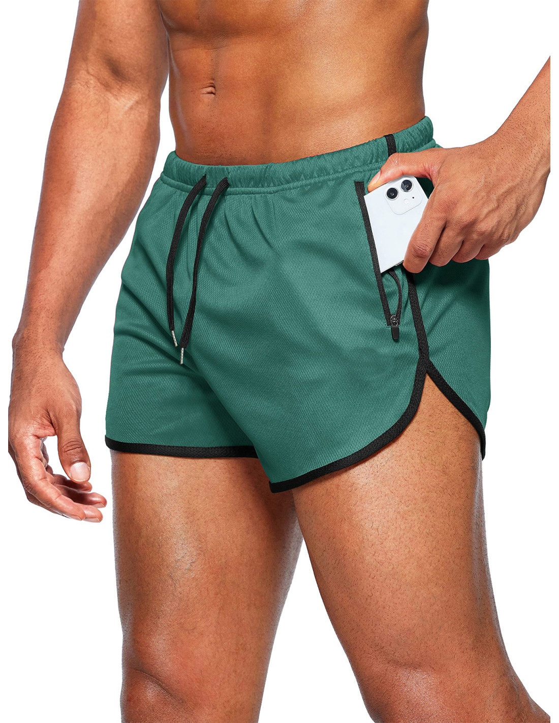 Темно-зеленые короткие мужские шорты для спорта и активного отдыха. Сетчатый полиэстер хорошо “дышит”, быстро отводит влагу и высыхает после интенсивной нагрузки. Короткая длина и боковые разрезы дают свободу движений при приседаниях, выпадах и динамичных упражнениях.